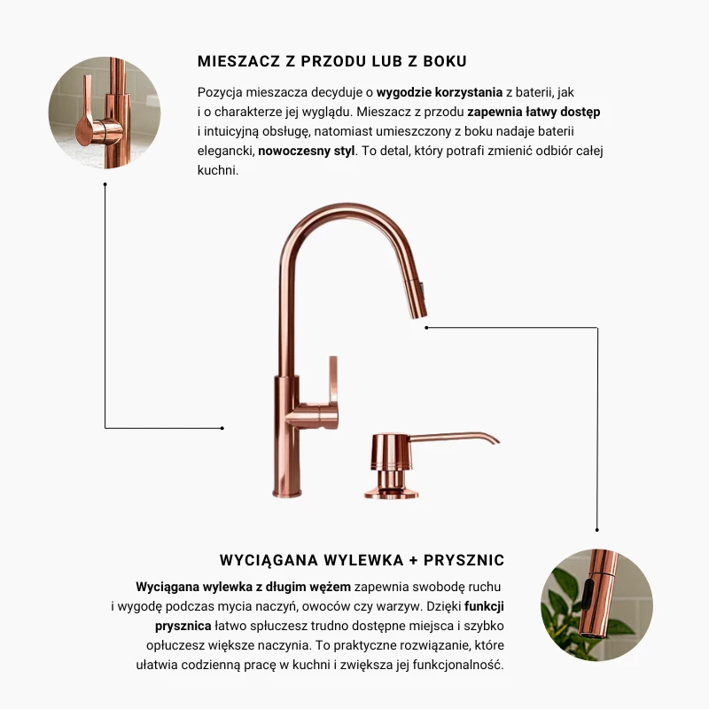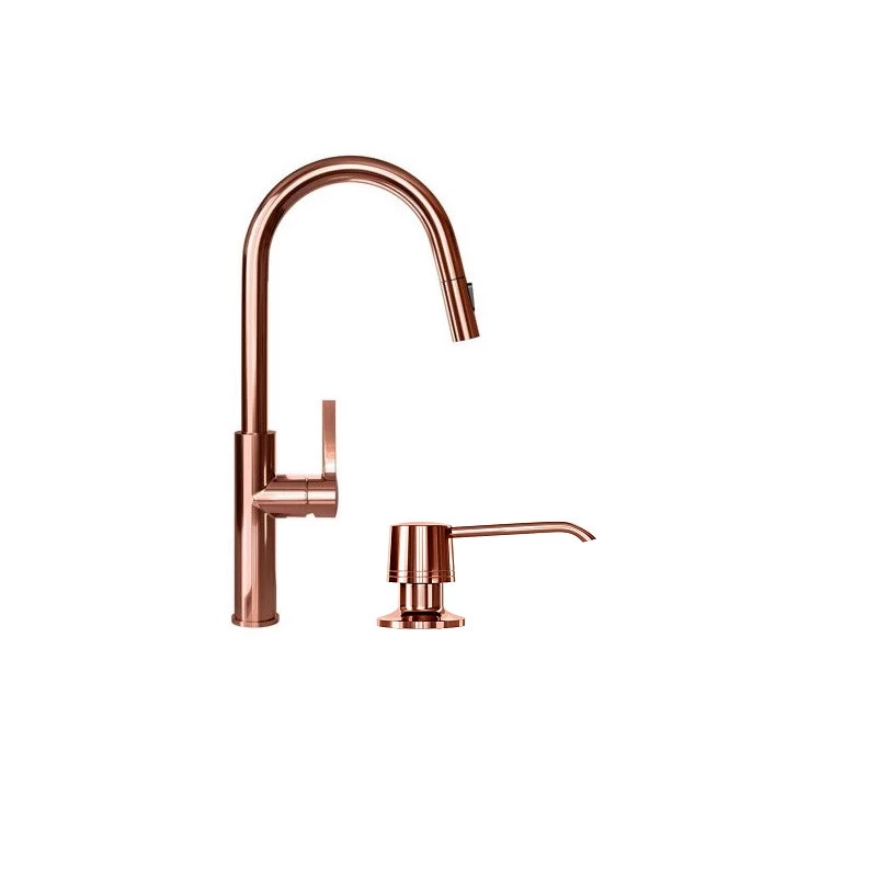 Entdecken Sie die Harmonie von Stil und Funktionalität in Ihrer Küche. Die GLOBALO Divio Copper Armatur im Set mit dem Intio Copper Seifenspender überzeugt durch elegantes Design und erleichtert Ihre täglichen Küchenarbeiten. Der ausziehbare Auslauf, die einfache Bedienung und die edle Kupferoberfläche machen Ihre Küche moderner und funktionaler – und Sie genießen höchsten Komfort im Alltag.