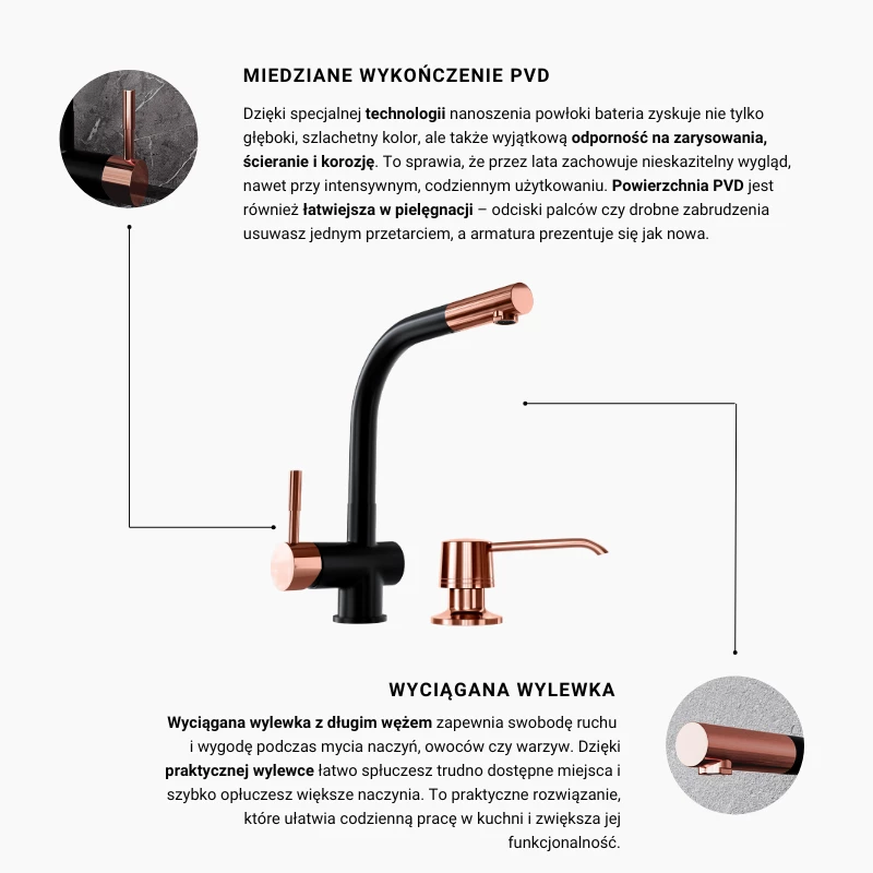 Verleihen Sie Ihrer Küche mit der Armatur Lobio Schwarz/Kupferring einen außergewöhnlichen Glanz. Das zur Herstellung verwendete Messing garantiert Langlebigkeit und Widerstandsfähigkeit gegen Beschädigungen. Der kupferne ausziehbare Auslauf ermöglicht eine präzise Steuerung des Wasserstrahls und erleichtert die tägliche Nutzung. Die Armatur Lobio ermöglicht eine präzise Kontrolle der Temperatur und der Strahlstärke. Kupferne Akzente sind nicht nur ein stilvolles Detail – sie sind Funktionalität in bester Ausführung.