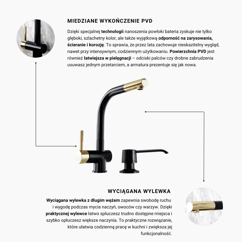 - Armatur und Spender bilden ein Duo, das Ästhetik und Funktionalität verbindet – die Küche wird moderner, und Sie genießen höchsten Komfort bei der täglichen Arbeit am Spülbecken.