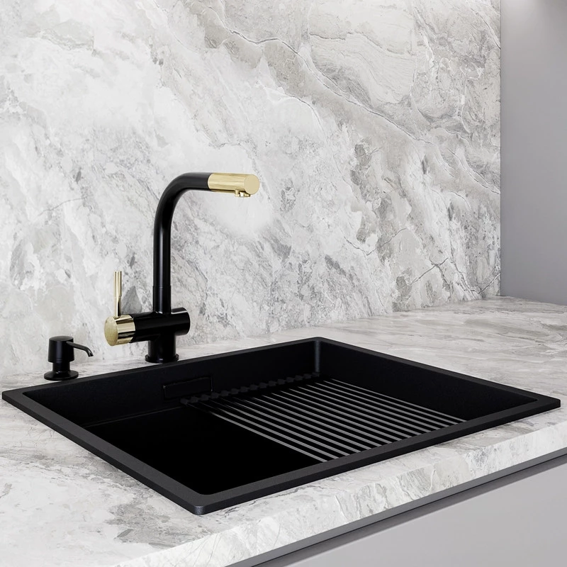 Küchenarmatur GLOBALO Lobio Black/Light Gold Ring mit Intio Black Spender
