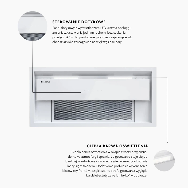 - Die in einem Schrank versteckte Haube arbeitet leise (47 dB auf der ersten Stufe) und sorgt so für angenehme Ruhe in der Küche.