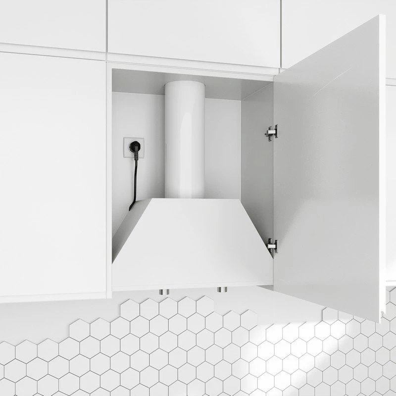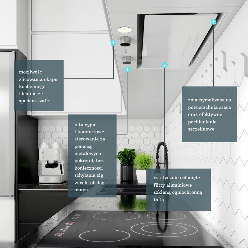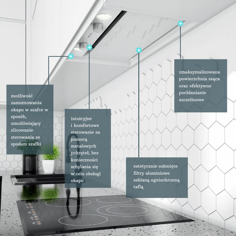 - Schowany w szafce okap jest cichy (45 dB na pierwszym biegu), a więc nie powoduje dyskomfortu wśród osób przebywających w kuchni.