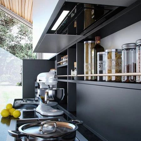 - Die Einbau-Dunstabzugshaube Loteo kann über Touch-Bedienung (das Bedienfeld verfügt auch über ein LED-Display) oder aus der Ferne – mit der im Set enthaltenen Fernbedienung – gesteuert werden.