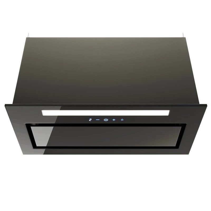 MaterialienDie Dunstabzugshaube Loteo 60.4 Schwarz ist aus elegantem, schwarzem gehärtetem Glas gefertigt.