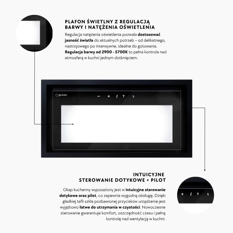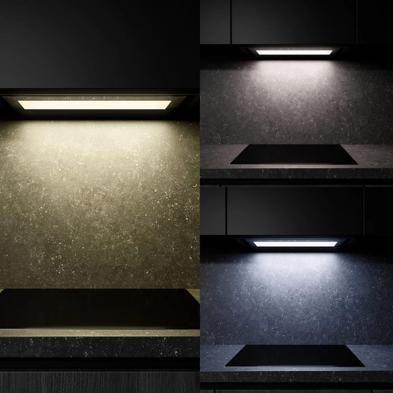 - Die Einbau-Dunstabzugshaube Loteo kann über Touch-Bedienung (das Bedienfeld verfügt auch über ein LED-Display) oder aus der Ferne – mit der im Set enthaltenen Fernbedienung – gesteuert werden.