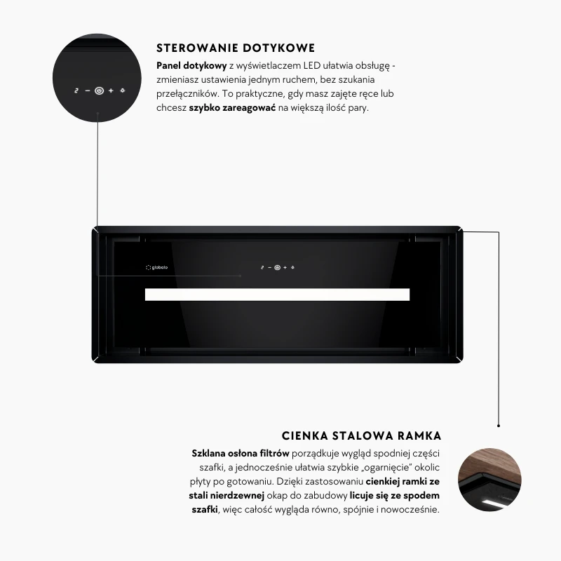 Die Einbau-Dunstabzugshaube Pinelio zeichnet sich durch besonders kompakte Abmessungen, stilvolles Design und hervorragende Parameter aus. Sie verfügt über eine elegante Glasfront mit LED-Streifen und Touchpanel. Diese Dunstabzugshaube erfüllt die Erwartungen von Personen, die praktische und geschmackvolle Lösungen für ihre Küchen suchen.