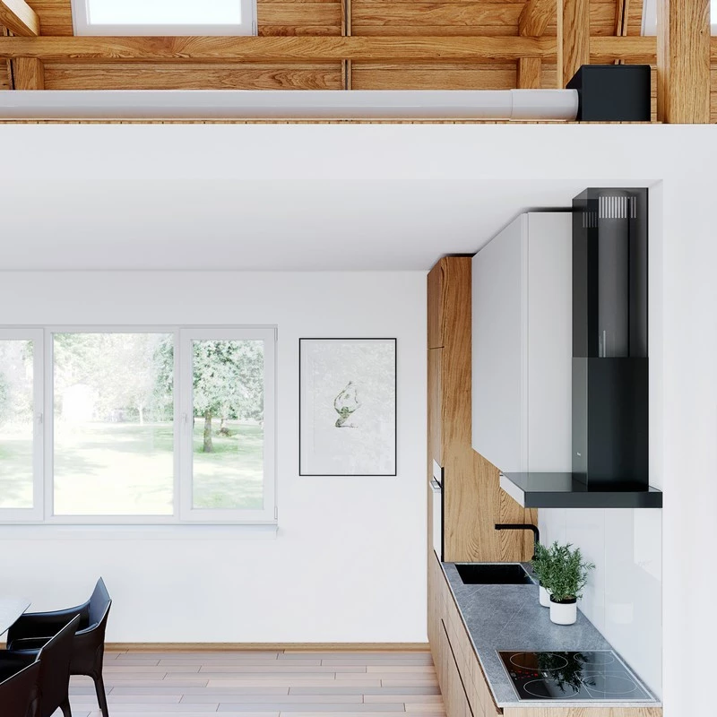 Die Dunstabzugshaube ist für den Betrieb im offenen Kreislauf bestimmt. Die Turbine wird außerhalb des Gebäudes montiert.