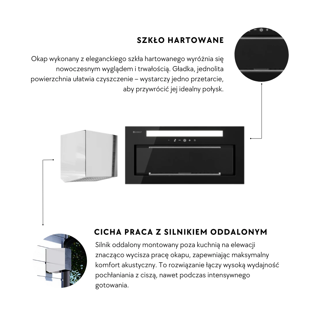 Wir präsentieren die perfekte Lösung für Liebhaber einer leisen Küche – die Dunstabzugshaube mit entferntem Motor. Das Set enthält die Einbau-Dunstabzugshaube Saredo 60.1 Black und den entfernten Motor TW 1.2. Dank der Möglichkeit, die Turbine außerhalb des Schranks zu platzieren, wird die Küche zu einem angenehm leisen Ort und bietet Komfort bei der Durchführung alltäglicher Aufgaben.