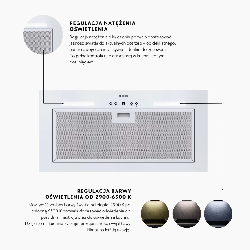 - Die Einbau-Dunstabzugshaube Viledo kann mit zwei Arten von Filtern ausgestattet werden: Aluminium- und Kohlefilter. Der Aluminiumfilter sammelt fettige Partikel und befreit die Schränke von einer schwer zu entfernenden Fettschicht. Der Kohlefilter (der nur im Umluftbetrieb installiert werden sollte) bekämpft unangenehme Gerüche.