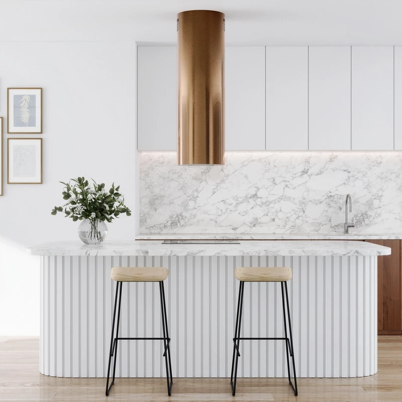 Einzigartig, stilvoll, elegant – die Lobelio ist weit mehr als nur eine Dunstabzugshaube. Sie ist ein echtes Design-Highlight für Ihre Küche und verleiht ihr eine luxuriöse Note. Die goldene, zylindrische Inselhaube vereint modernes Design mit innovativer Technologie. Mit diesem Gerät genießen Sie eine ruhige, saubere Küche, frei von Dampf und unangenehmen Gerüchen.