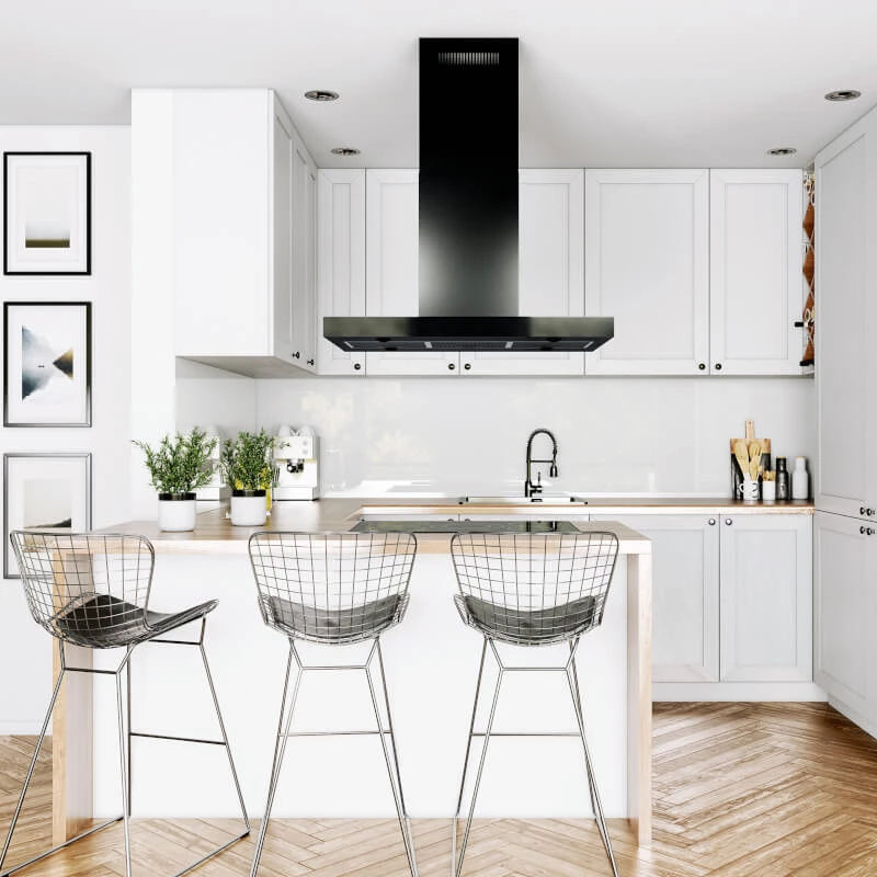 Das klassische Design der Dunstabzugshaube Verta Isola 90.3 H2H Schwarz eignet sich für helle, geräumige Innenräume – über der Kücheninsel.