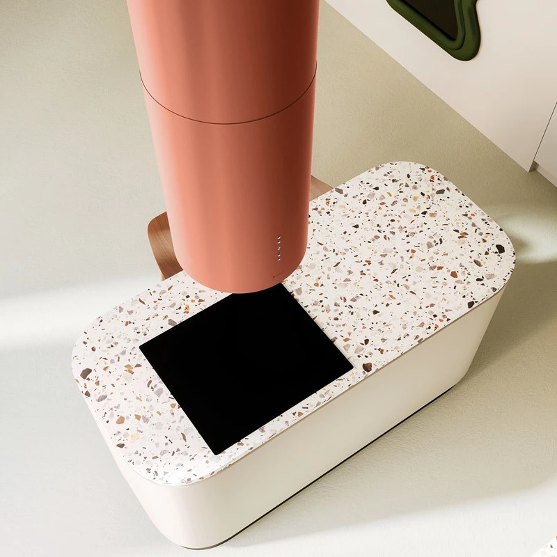 - Diese elegante, zylindrische Inselhaube in hellem Kaschmir ist ein vielseitiges Gerät, das sowohl als Abluft- als auch als Umlufthaube verwendet werden kann. Im Abluftmodus leitet sie Luft und Wasserdampf nach außen (erfordert einen Anschluss an den Luftkanal). Im Umluftmodus hingegen wird die Luft durch einen Kohlefilter gereinigt und zurück in die Küche geleitet.