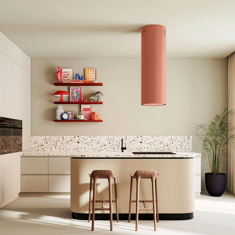 Die zylindrische Inselhaube in stilvollem Off-White ist ein Muss für jede moderne Küche! Sie fügt sich nicht nur perfekt in das Interieur ein, sondern sorgt auch für maximalen Kochkomfort. Der warme, gebrochene Weißton harmoniert hervorragend mit japandi- und skandinavischen Küchenstilen und schafft eine einladende Atmosphäre. Mit einer beeindruckenden Leistung von 742 m³/h beseitigt die Haube effizient Dämpfe und Gerüche – selbst bei intensivem Kochen. Dank der leisen Betriebsweise von nur 46 dB bleibt Ihre Küche eine ruhige Oase ohne störenden Lärm.