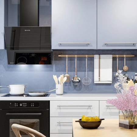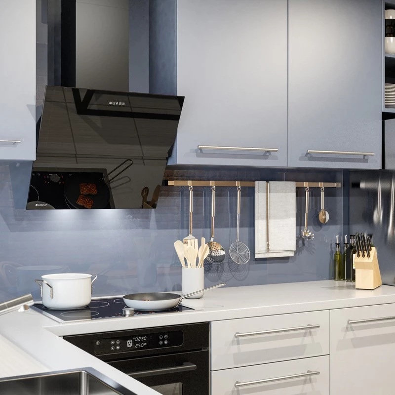 • Die präsentierte Dunstabzugshaube wird über einen Touchscreen gesteuert. Das Touch-Bedienfeld ist mit einer LED-Anzeige ausgestattet. Im Lieferumfang ist zudem eine Fernbedienung enthalten, sodass die Steuerung auch aus der Ferne möglich ist.
