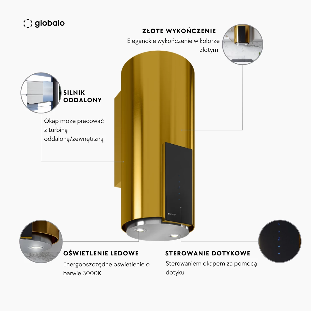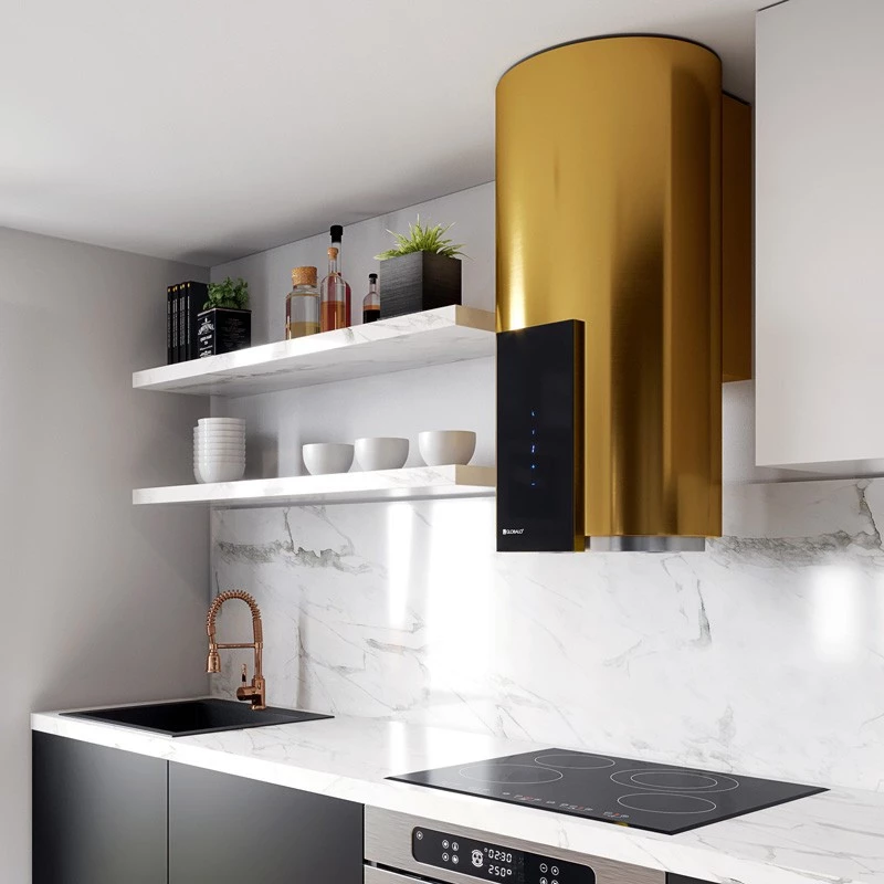 Die goldene Wandhaube Roxano 39.1 Gold ist eine wahre Perle unter den runden Wandhauben und besticht durch ihr einzigartiges Design und die zeitlose Eleganz der verwendeten Materialien. Dieses Modell vereint modernste Technologie, hohe Funktionalität und außergewöhnliches Design.