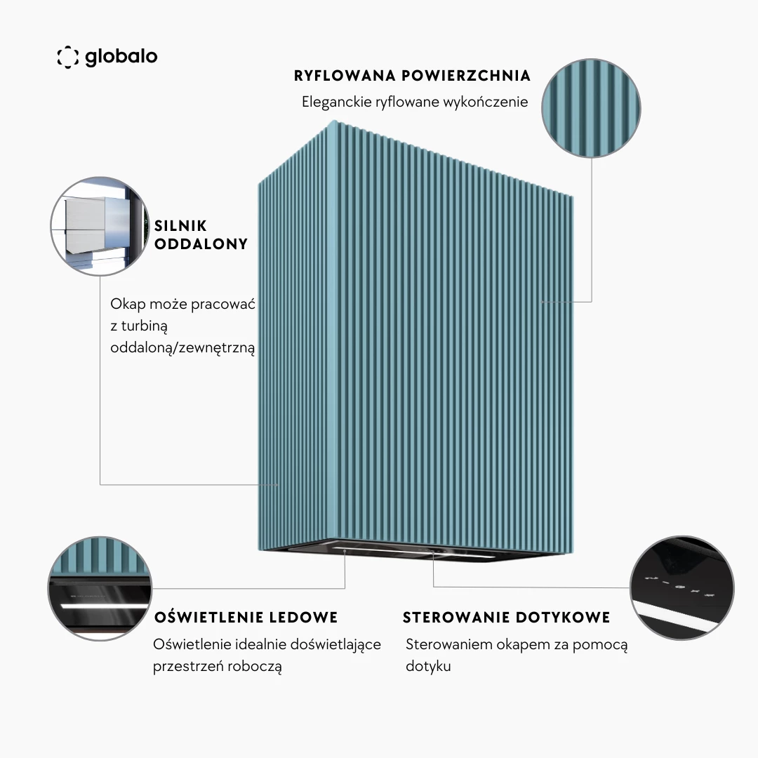 Die leichte und elegante Form der Wandhaube Lowio 60.1 BL/Ocean Blue wurde speziell für moderne, helle Küchen entwickelt. Ihr außergewöhnliches Design begeistert Liebhaber einzigartiger Küchengeräte. Die Dunstabzugshaube wird zusammen mit einem Küchenschrank verkauft, dessen dekorative, gerillte Oberfläche jeden Trendliebhaber erfreuen wird.