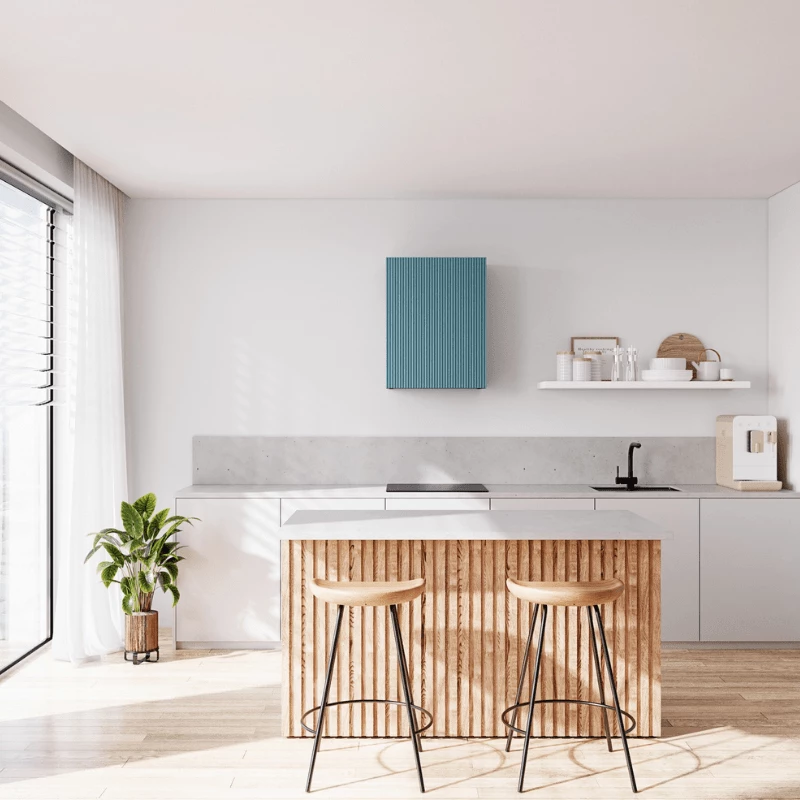 - Lowio kann bündig mit Standard-Küchenschränken mit einer Tiefe von 32 cm installiert werden. Der Luftauslass der Haube befindet sich an der Oberseite des Schranks (ein Abluftrohr ist im Set enthalten). In dieser Konfiguration kann die Haube im Umluftbetrieb arbeiten. Alternativ ist ein Anschluss an einen Wandlüftungskanal möglich – für weitere Informationen stehen unsere Berater zur Verfügung.