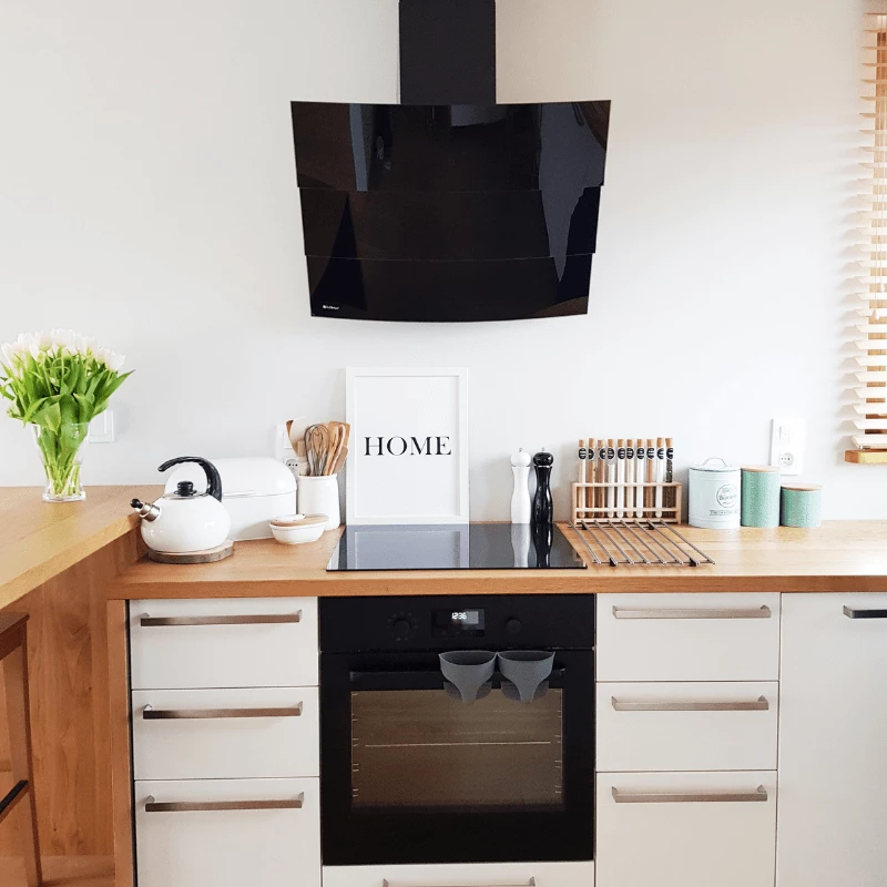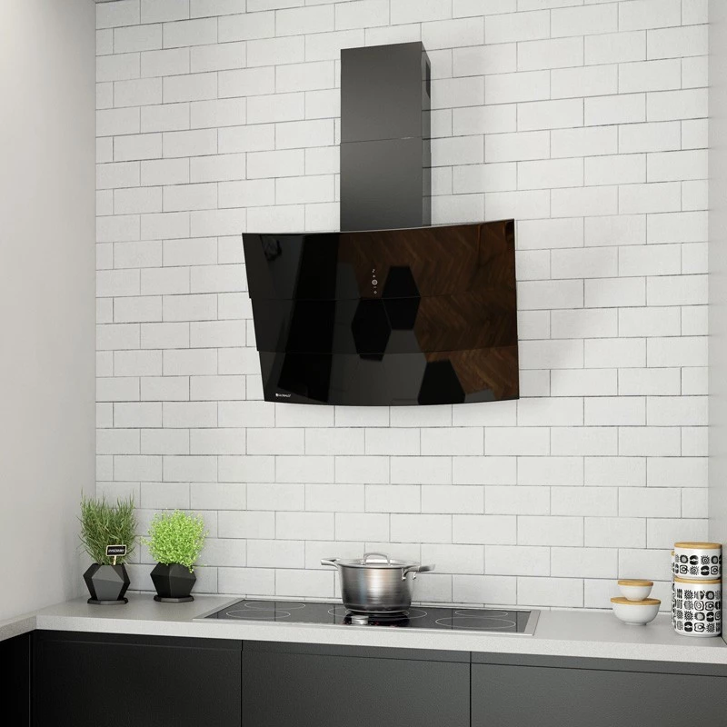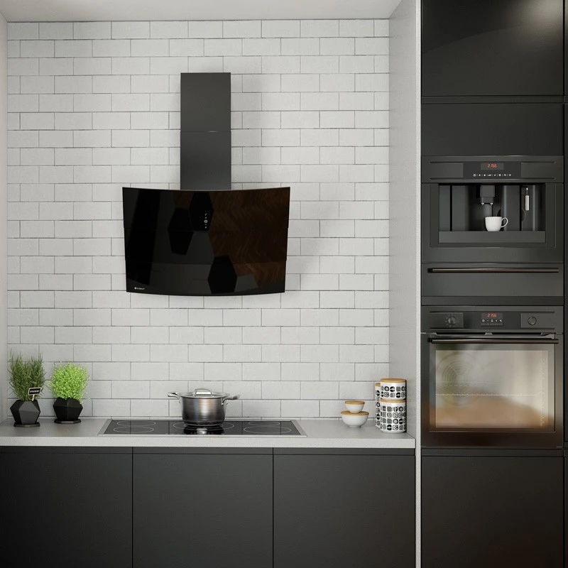 Die Vintio 75.2 Black ist eine schräge Dunstabzugshaube, die sich in verschiedene Einrichtungsstile einfügt – sowohl in minimalistische und dezente als auch in farbenfrohe und futuristische Räume.