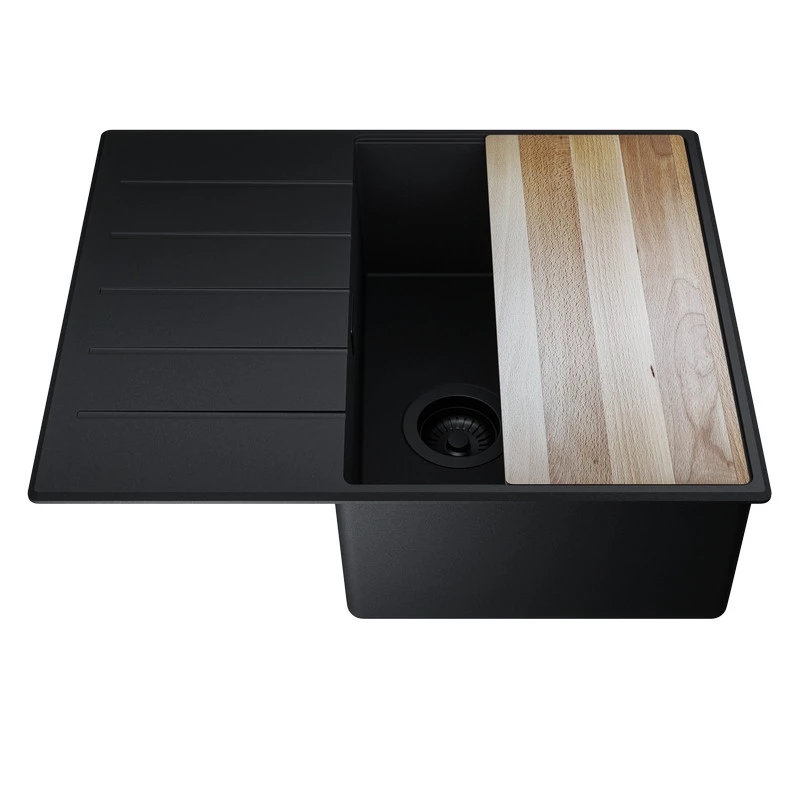 - Schwarze Rollmatte und Schneidebrett im Set – Die Matte dient als Abtropfgitter für Geschirr, als Unterlage für Töpfe oder als zusätzliche Arbeitsfläche, wodurch die Funktionalität der Spüle erheblich erweitert wird. Das mitgelieferte Schneidebrett bietet eine stabile Schneidefläche.
