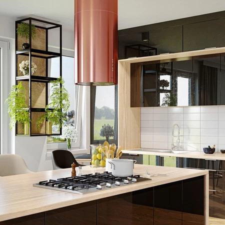 Die zylindrische Insel-Dunstabzugshaube ist ein beeindruckendes Gerät, dank dem die Kücheninsel nicht nur ein Schmuckstück des Raumes sein wird, sondern auch eine komfortable Arbeitsfläche, die hervorragend zum Zubereiten von Mahlzeiten geeignet ist.