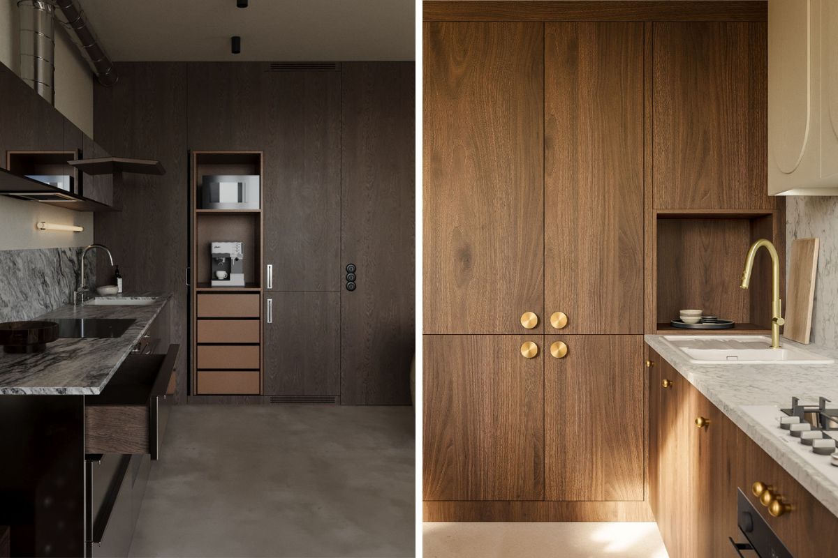Wood – whether in the form of natural veneer or high-quality laminates – has always been synonymous with elegance and durability. Today, however, we are witnessing a new wave of interest in brown kitchens: from warm oak shades to noble, darker walnut variants. Designers increasingly use these materials not as an addition but as the main theme of the arrangement.