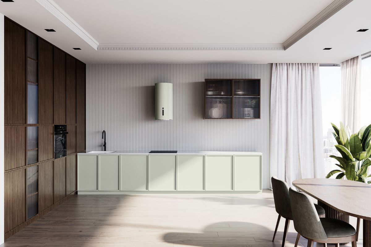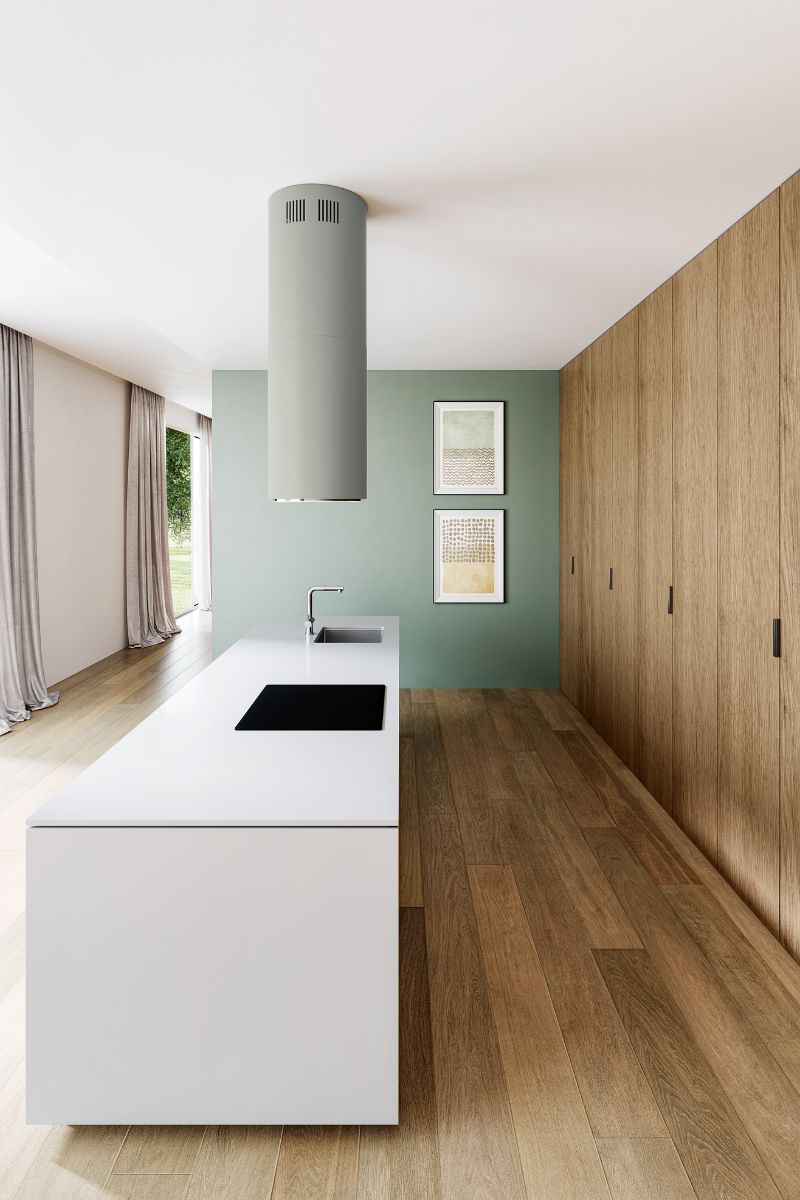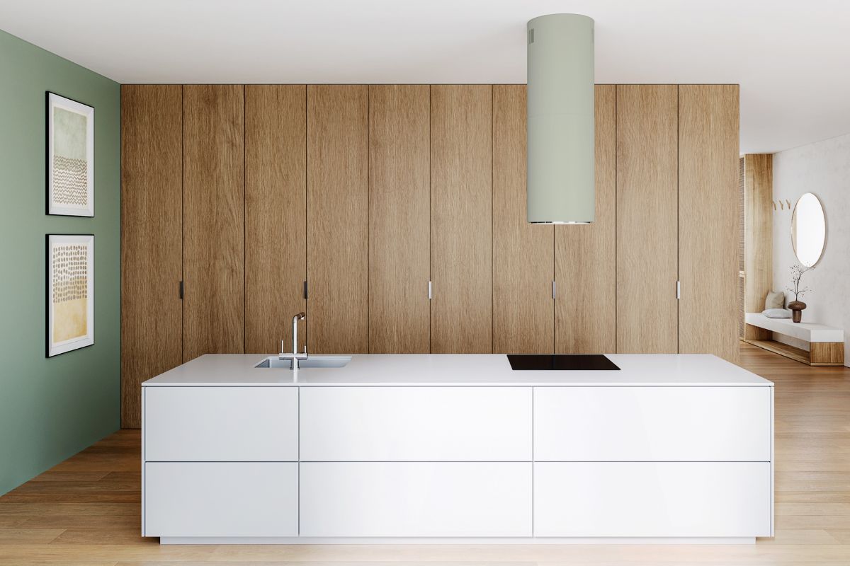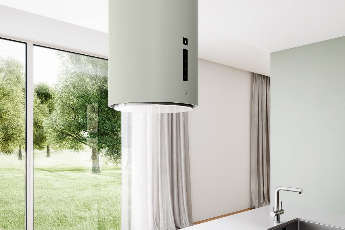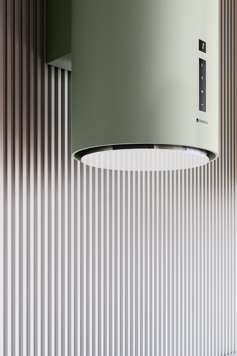 GLOBALO has responded to this demand by introducing Miraya hoods in a refined sage green finish. Available in both wall-mounted and island versions, they allow full visual integration with sage-colored cabinetry or wall tones.