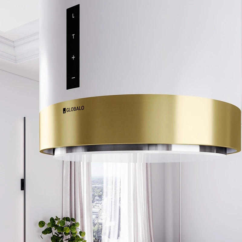 Discover the new Ring series of cooker hoods from Globalo, where minimalism meets elegance. The hood is characterised by the subtlety of its form, while being enhanced with a refined accent in the form of a golden ring. The Heweno not only excels at removing odours but also serves as a design feature in the kitchen interior. Precisely crafted, it provides efficient ventilation and brings a unique and luxurious touch to the kitchen space.