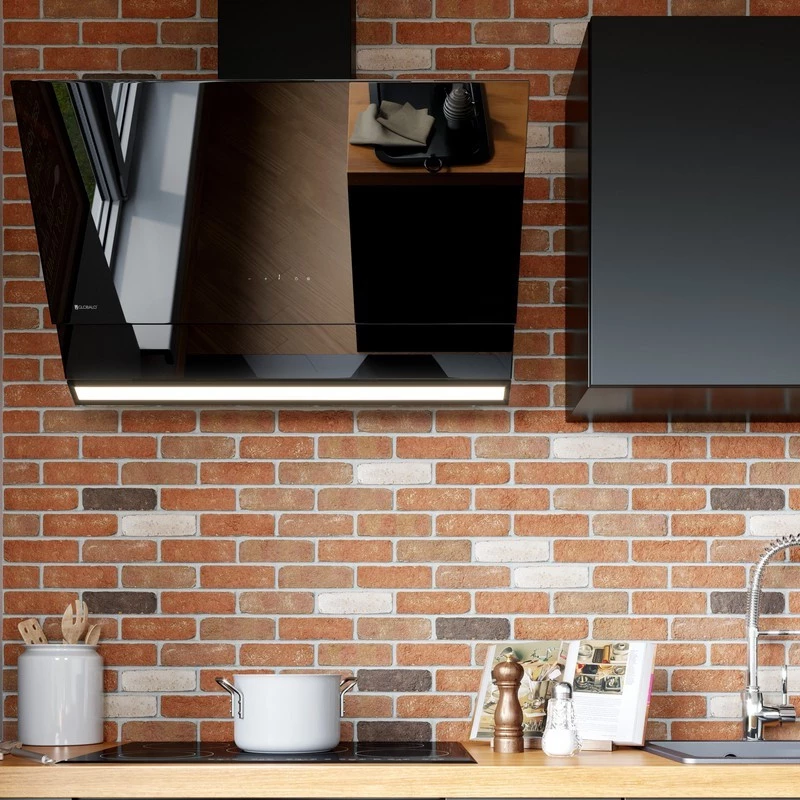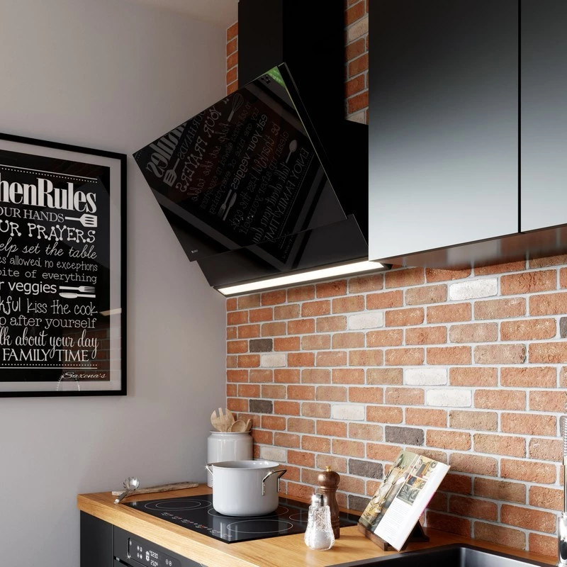 - The presented wall-mounted inclined cooker hood can operate in two modes. The extractor quickly and efficiently filters the air in the kitchen, while the exhaust (when connected to a ventilation duct) removes fumes outside.