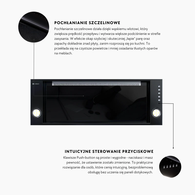 The Desolero 90.2 Black hood is often chosen for closed kitchens as well as larger kitchens open to other rooms. It works very well in modern kitchen furniture as well as more classic ones, and the hood is placed in specially prepared structures.