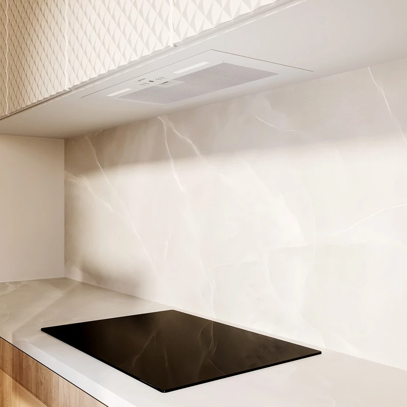 Korpus z lakierowanej stali w kolorze białym oraz cienka ramka ze stali nierdzewnej sprawiają, że okap idealnie licuje się z dolną krawędzią szafki. Dyskretny wygląd i pełna funkcjonalność – to doskonały wybór do nowoczesnej kuchni.