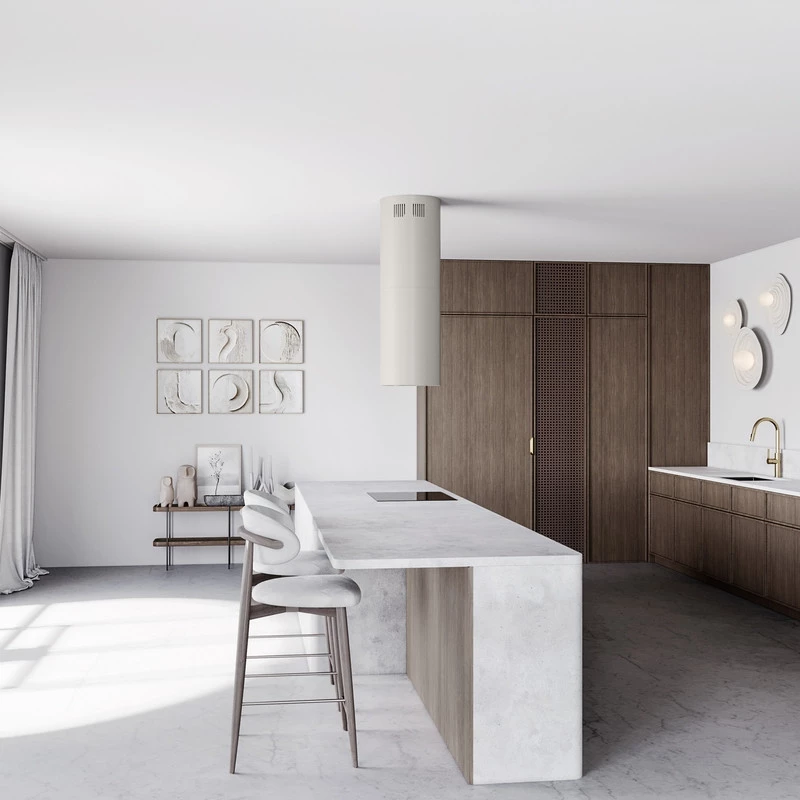 The cylindrical island cooker hood is an impressive device, thanks to which the kitchen island will not only be a decoration of the room but also a comfortable work surface, perfectly adapted for meal preparation.