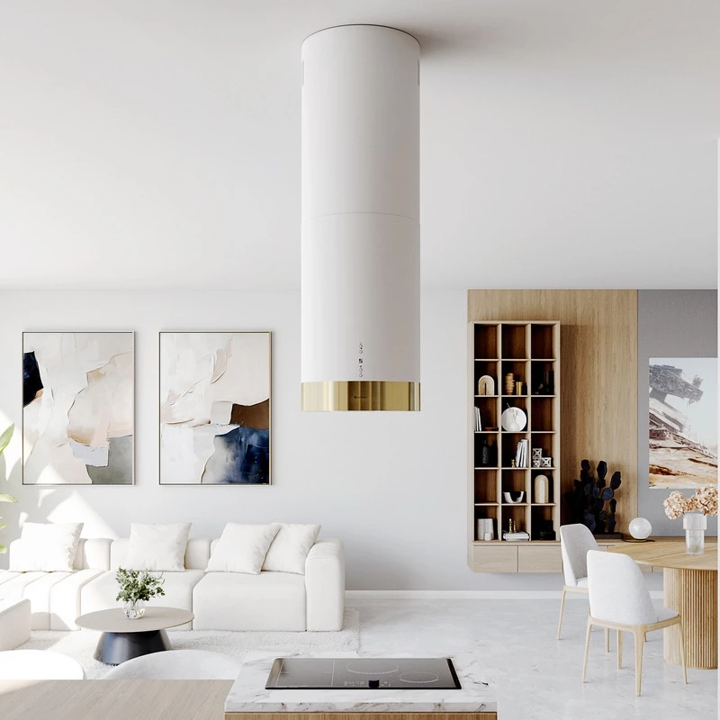 The cylindrical island cooker hood is a striking appliance that makes your kitchen island not only a decorative feature but also a comfortable workspace, perfectly suited for meal preparation.