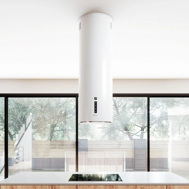 Heweno Isola is a cooker hood designed for modern kitchens open to the living room. It is a perfect complement to kitchen islands. The cylindrical shape and semi-matte white finish make the cooker hood eye-catching and decorative.