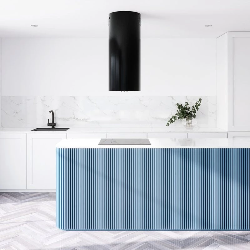 • The Lobelio Isola 39.1 Black island cooker hood can operate as both an extractor and a recirculator. The extractor removes steam and airborne grease outside the kitchen, but it requires a connection to a ventilation duct. The recirculator, on the other hand, purifies the air and recirculates it back into the kitchen.