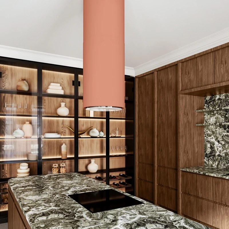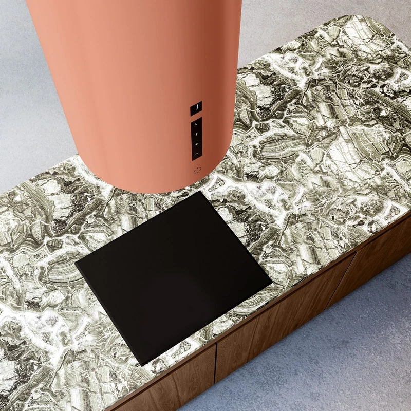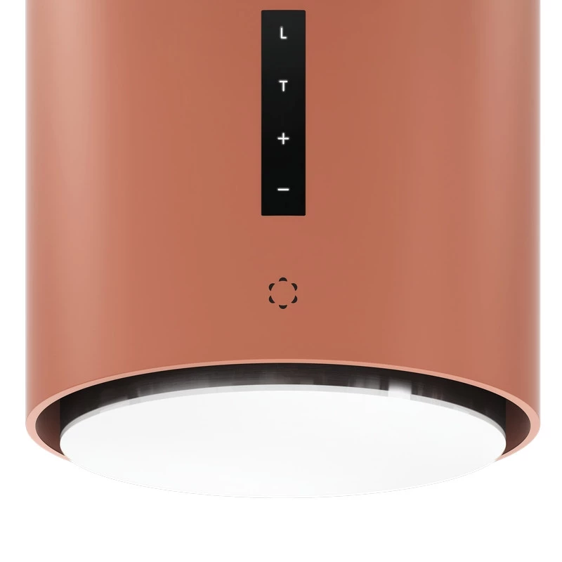 This cylindrical island cooker hood in a subtle brick tone is an essential feature of every modern and elegant kitchen! Its design perfectly complements minimalist interiors while offering unparalleled comfort during cooking. Thanks to an impressive extraction rate of 675 m³/h, unwanted odours and vapours are quickly removed—even during intense cooking. What’s more, its quiet operation at just 43 dB keeps your kitchen a calm and noise-free space.