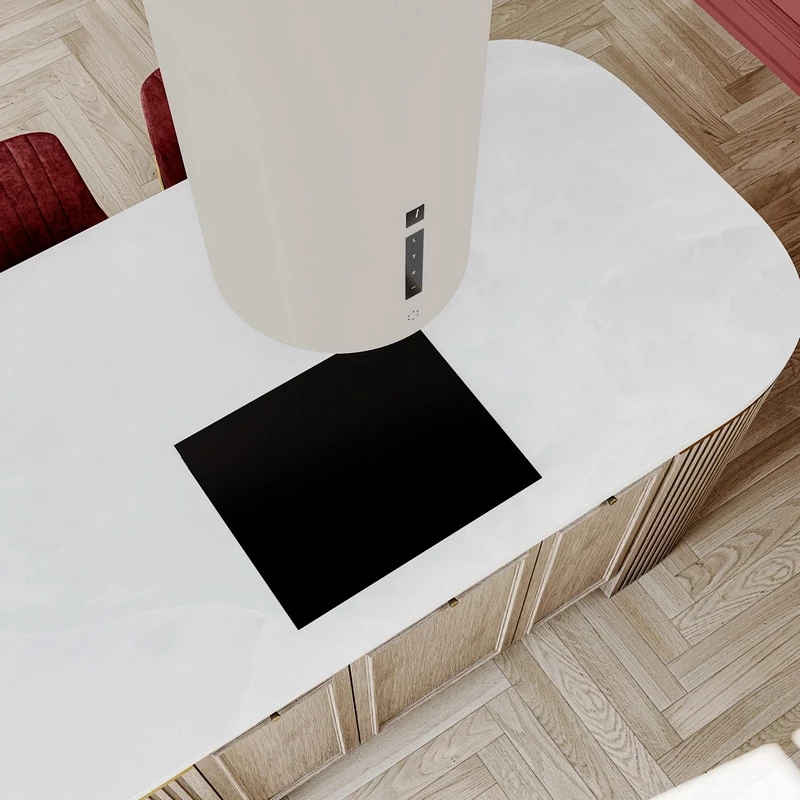 This cylindrical island hood in a subtle cashmere shade is an essential element in any modern and elegant kitchen! Its design perfectly complements minimalist interiors while providing unmatched comfort during cooking. With an impressive performance of 675 m³/h, it quickly removes unwanted odours and fumes, even during intense cooking. Additionally, its quiet operation, with a noise level of only 43 dB, ensures that your kitchen remains a peaceful place, free from noise.