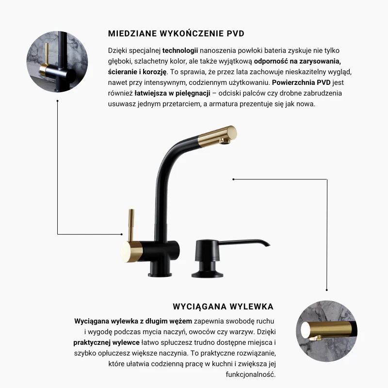 The GLOBALO Lobio Black/Light Gold Mat Ring set with the Intio Black dispenser is the perfect choice for those who value both beauty and functionality. The faucet blends seamlessly into both modern and classic interiors, while the dispenser subtly completes the look. With its elegant finish and thoughtful solutions, your kitchen becomes even more stylish and user-friendly.