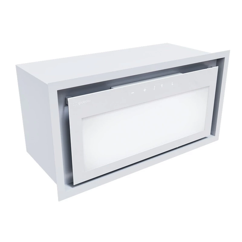 The Salviro 60.1 White is made of elegant white tempered glass and white lacquered steel. A thin stainless-steel frame ensures the hood aligns perfectly with the bottom edge of the cabinet, creating a seamless surface with your kitchen furniture. This precise fit makes the hood almost invisible, subtly blending into the cabinetry without disrupting the modern kitchen aesthetic. This design allows you to maintain a minimalist look while preserving full functionality.