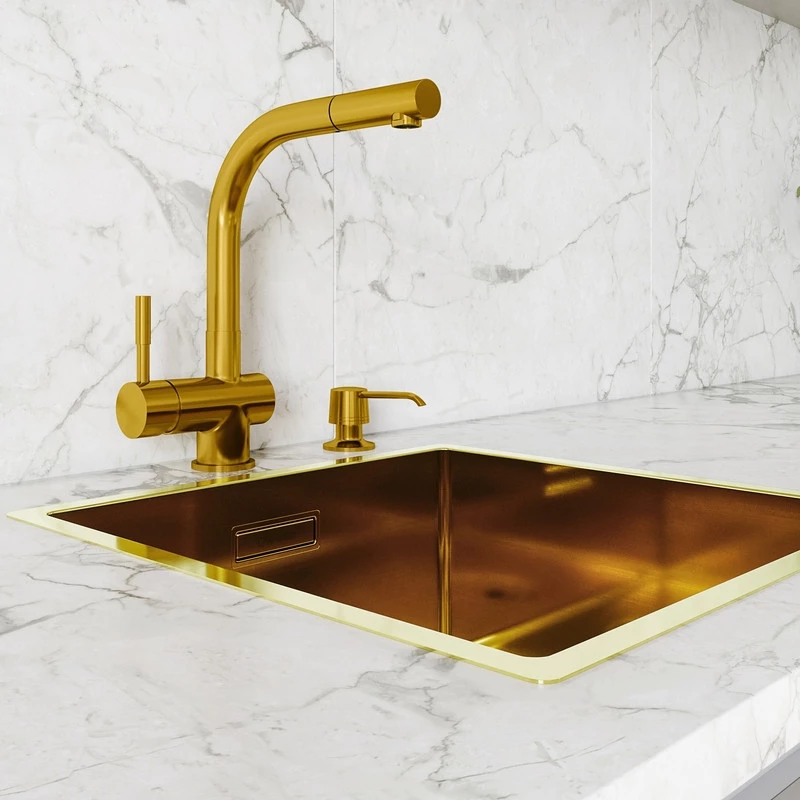 The gold Riwolo kitchen sink impresses with its beautiful design and functionality. It will be a functional and practical element of your kitchen, as well as a tasteful decoration that will add a unique character to the entire space. Riwolo is the perfect choice for those who value high-quality craftsmanship and original design. The elegant shape and color make the sink suitable for both modern and classic kitchens.