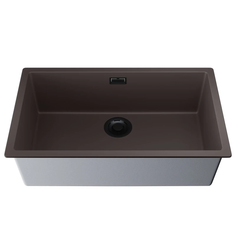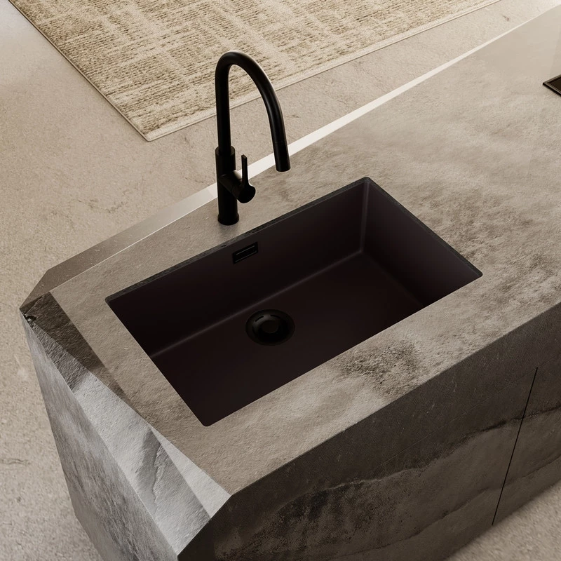 Korpus wykonany z nowoczesnego kompozytu mineralnego, łączącego mikro-ceramikę, kwarc i żywicę akrylową o podwyższonych właściwościach hydrofobowych. Dzięki temu zlew jest wyjątkowo trwały, odporny na wysokie temperatury, zarysowania i przebarwienia, a kolor Dark Chocolate pozostaje intensywny i elegancki przez długie lata użytkowania.