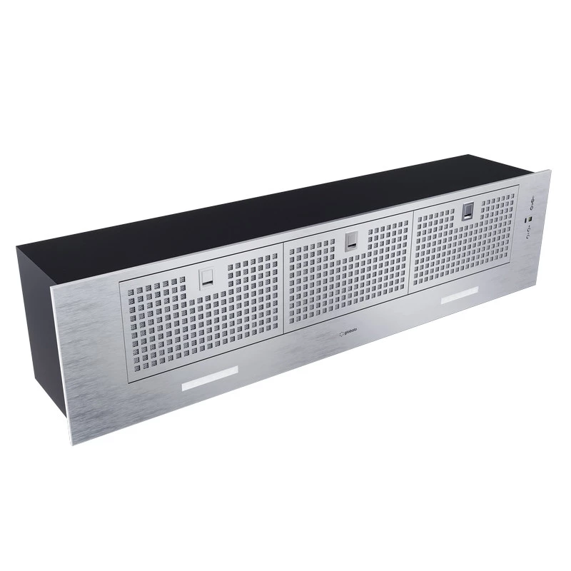 Okap wykonany został z wysokiej jakości stali szczotkowanej. Dzięki zastosowaniu cienkiej ramki ze stali nierdzewnej, okap do zabudowy idealnie licuje się z dolną krawędzią szafki, tworząc jednolitą powierzchnię z meblami kuchennymi. Precyzyjne dopasowanie sprawia, że okap staje się niemal niewidoczny, subtelnie wtapiając się w zabudowę i nie zaburzając estetyki nowoczesnej kuchni. Taki zabieg pozwala zachować minimalistyczny wygląd, jednocześnie nie rezygnując z pełnej funkcjonalności urządzenia.