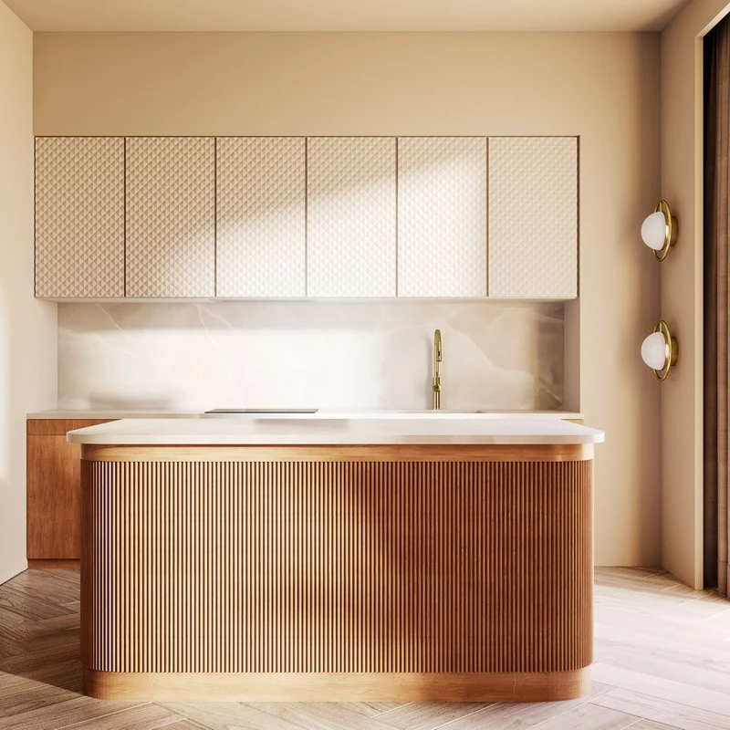 Okap wykonany został ze stali lakierowanej na kolor biały. Dzięki zastosowaniu cienkiej ramki ze stali nierdzewnej, okap do zabudowy idealnie licuje się z dolną krawędzią szafki, tworząc jednolitą powierzchnię z meblami kuchennymi. Precyzyjne dopasowanie sprawia, że okap staje się niemal niewidoczny, subtelnie wtapiając się w zabudowę i nie zaburzając estetyki nowoczesnej kuchni. Taki zabieg pozwala zachować minimalistyczny wygląd, jednocześnie nie rezygnując z pełnej funkcjonalności urządzenia.