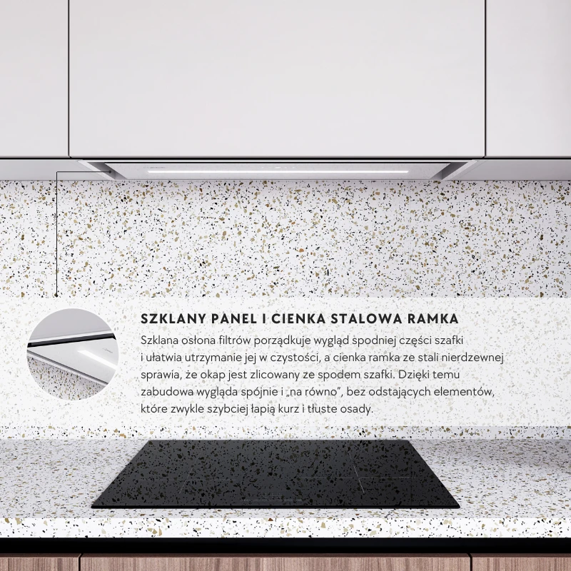 W codziennym użytkowaniu docenisz też detale, które robią różnicę: szklana osłona filtrów porządkuje wygląd spodniej części szafki i ułatwia utrzymanie jej w czystości, a cienka ramka ze stali nierdzewnej sprawia, że okap jest zlicowany ze spodem szafki. Dzięki temu zabudowa wygląda spójnie i „na równo”, bez odstających elementów, które zwykle szybciej łapią kurz i tłuste osady.