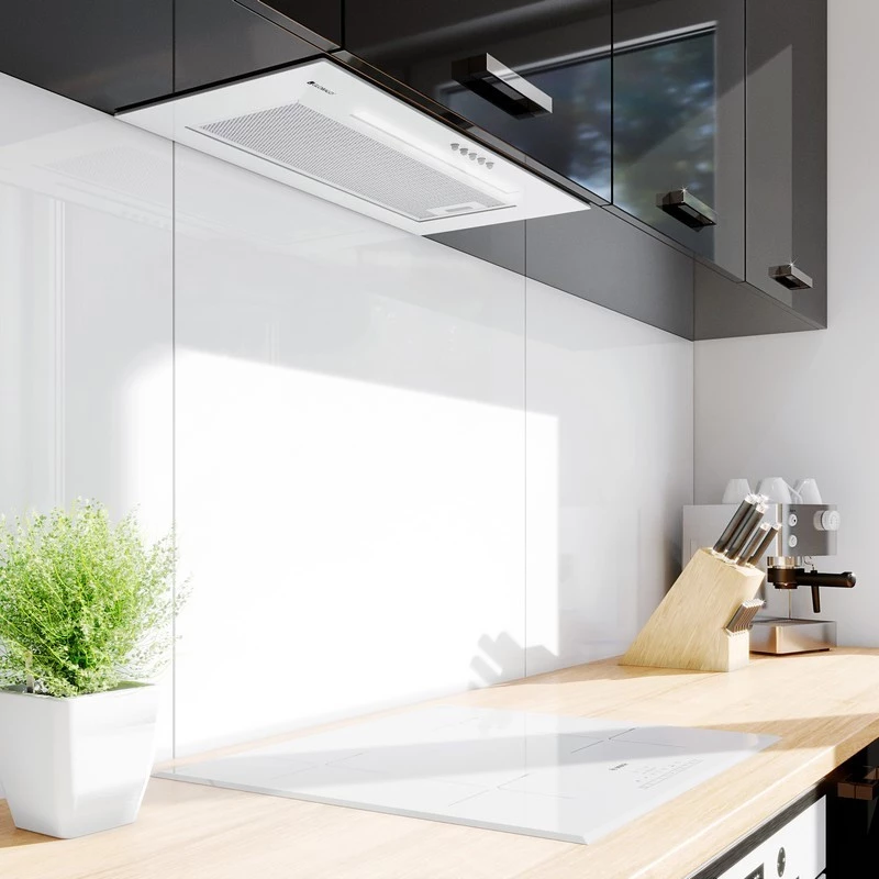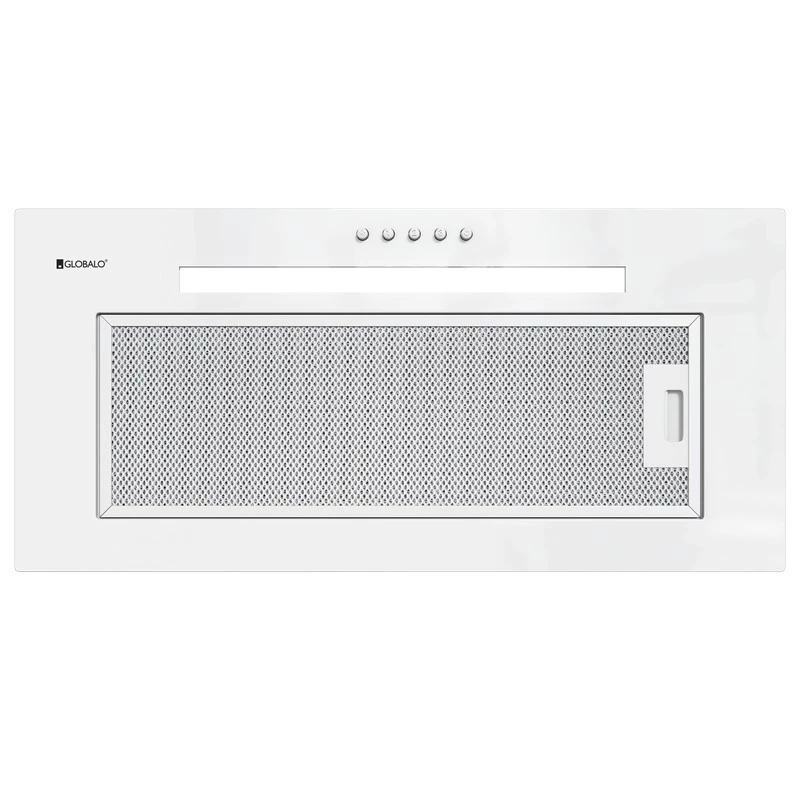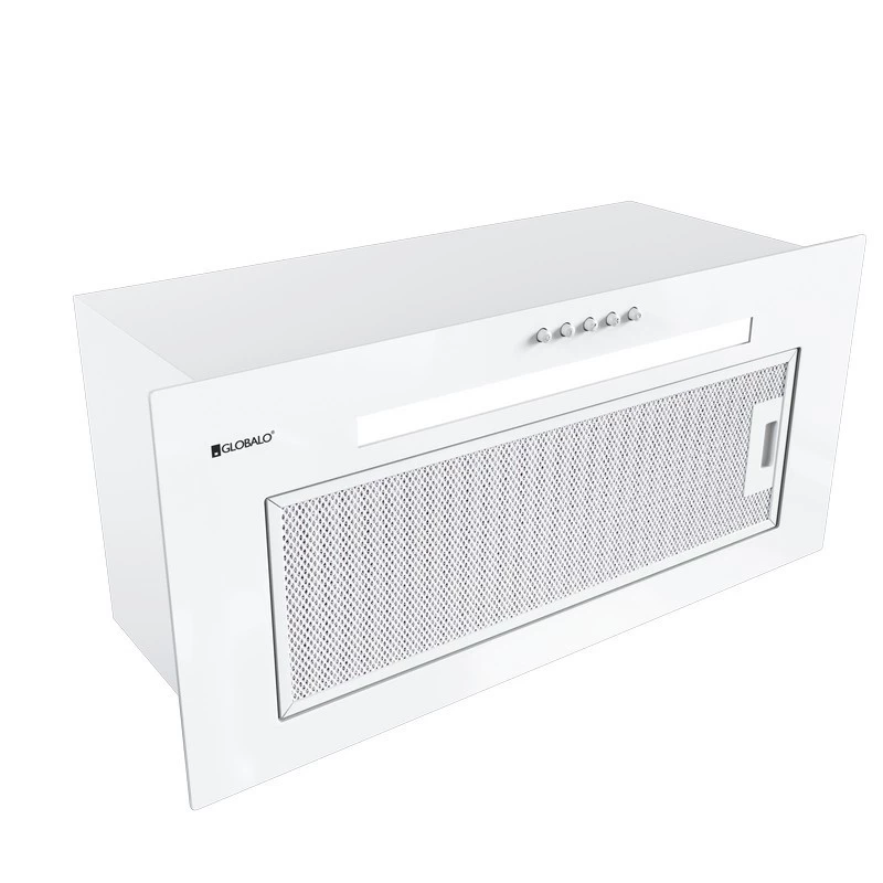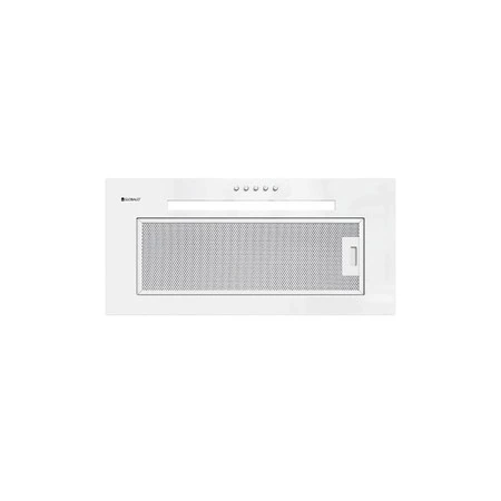 Klasa energetyczna D, do zabudowy, szer 59,6 cm, gł 28 cm, sterowanie push-button, zakres prędkości: 3, wydajność max. 305 m 3/h, głośność min. 47 dB, wykonanie: hartowane szkło w kolorze białym, oświetlenie pasek Led 5 W o neutralnej barwie. Linia GLOBALO Design
