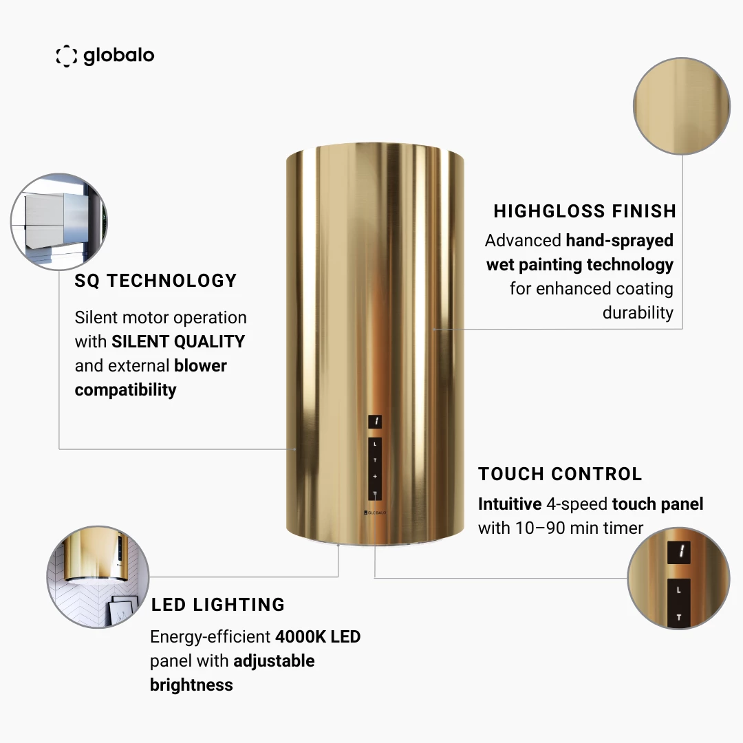 Heweno 39.3 Light Gold to nowoczesny, przyścienny okap w kształcie tuby, który wyróżnia się wyjątkowym designem i subtelnym złotym wykończeniem. Jego elegancki wygląd idealnie pasuje do kuchni w stylu nowoczesnym, glamour czy minimalistycznym. Wykonany z trwałych materiałów, łączy estetykę z niezawodnością. Dzięki zaawansowanej technologii skutecznie usuwa zapachy i opary, zapewniając świeżość w kuchni. Jeśli szukasz stylowego i funkcjonalnego rozwiązania, ten model spełni Twoje oczekiwania.