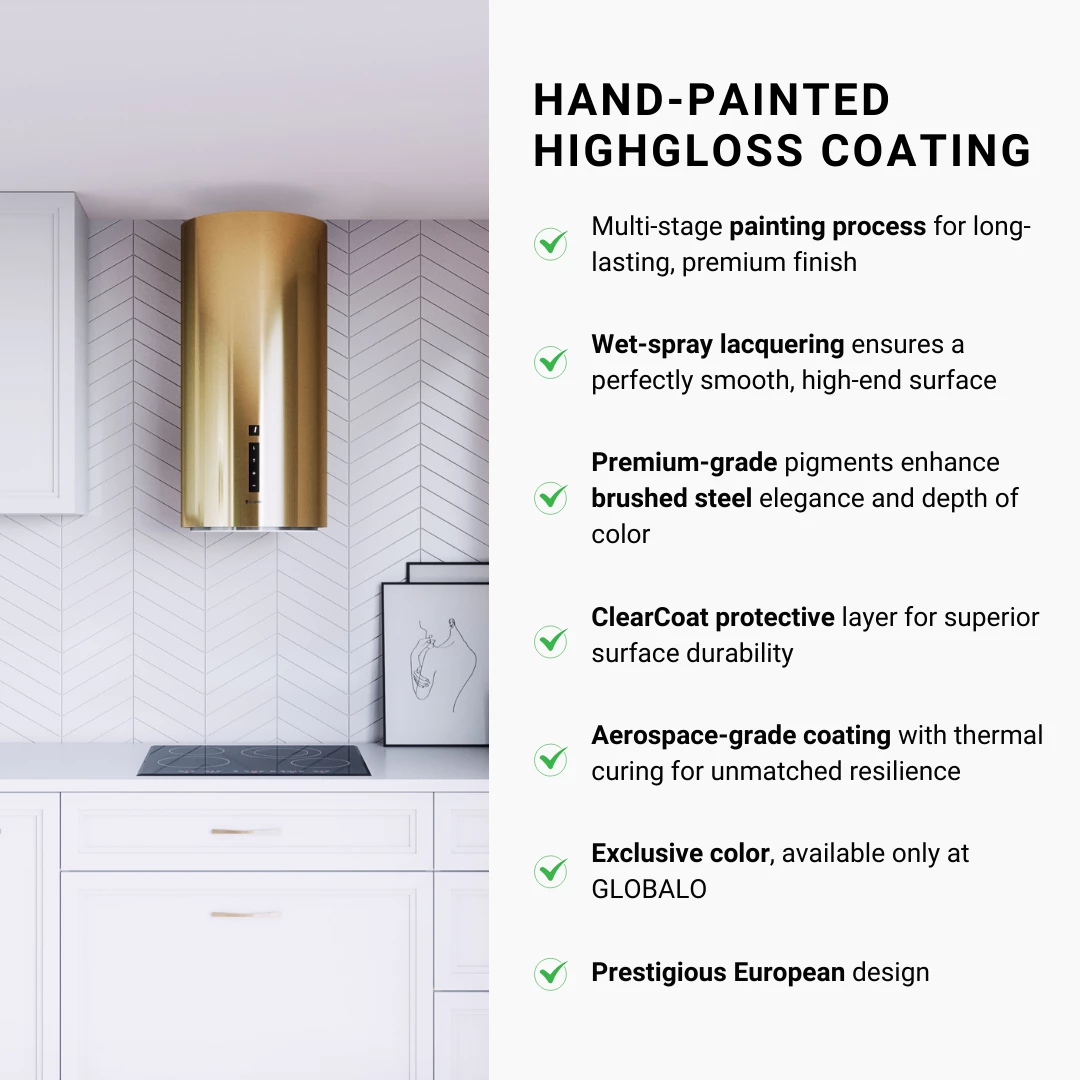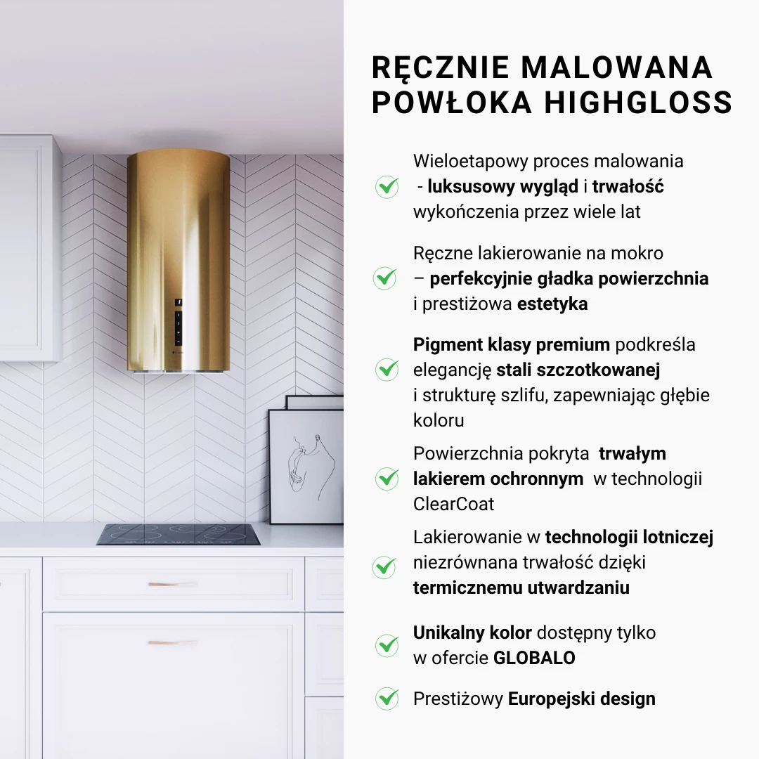 MateriałyPołączenie stali lakierowanej na jasne złoto oraz wygodnego sterowania dotykowego pozwoliło stworzyć okap o niebanalnej stylistyce i ponadczasowym designie.