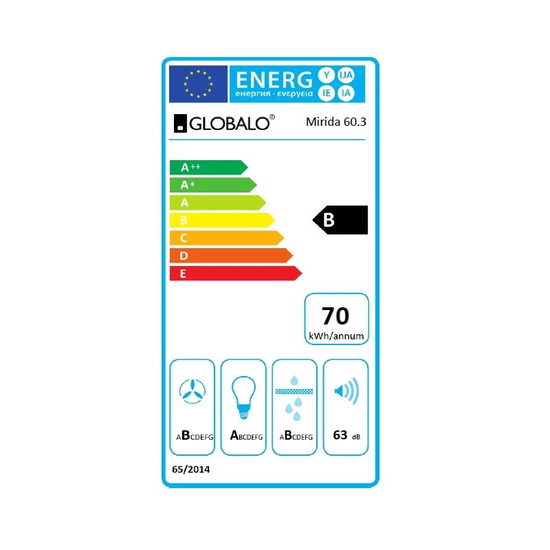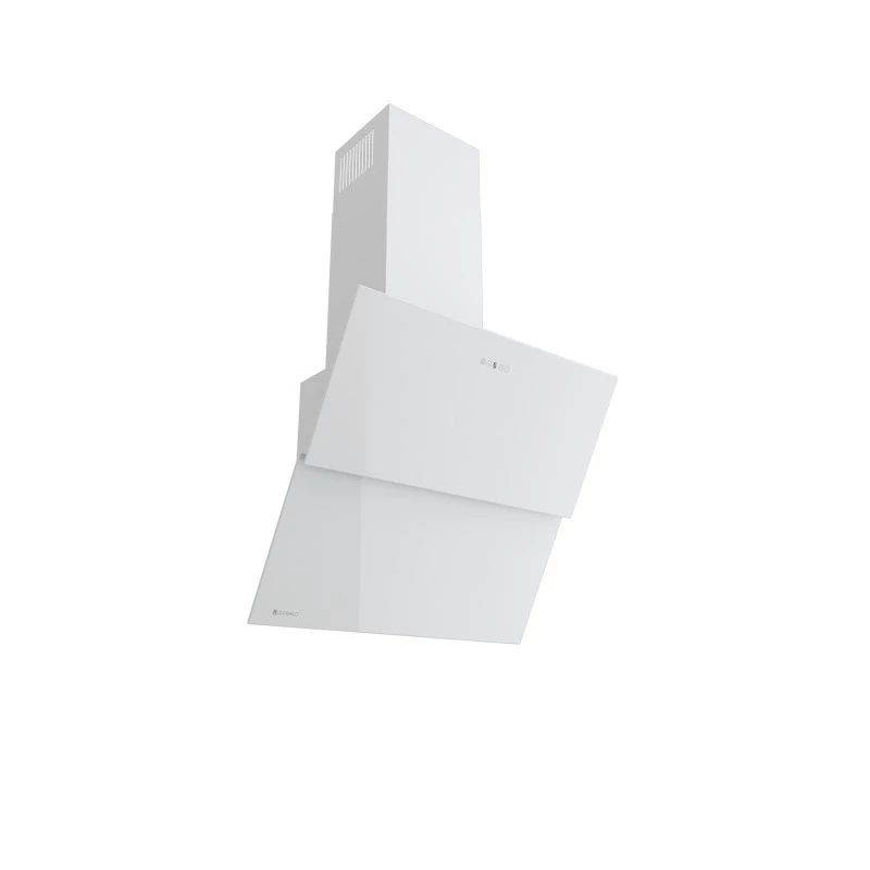 Klasa energetyczna B, przyścienny skośny, szer. 60 cm, gł. 41 cm, sterowanie sensorowe (dotykowe) z wyświetlaczem LED, zakres prędkości: 3 + boost, wydajność max. 670 m3/h, głośność min. 52 dB, wykonanie: białe hartowane szkło, stal lakierowana na biało, oświetlenie diodowe 2 x 3 W. Linia GLOBALO Design