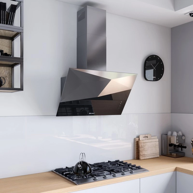 Połączenie czarnego hartowanego szkła oraz unikalnego wzoru stali nierdzewnej inox pozwoliło stworzyć okap o niebanalnej stylistyce i ponadczasowym designie.