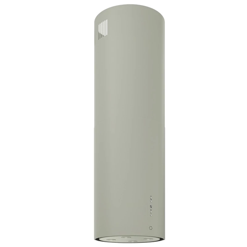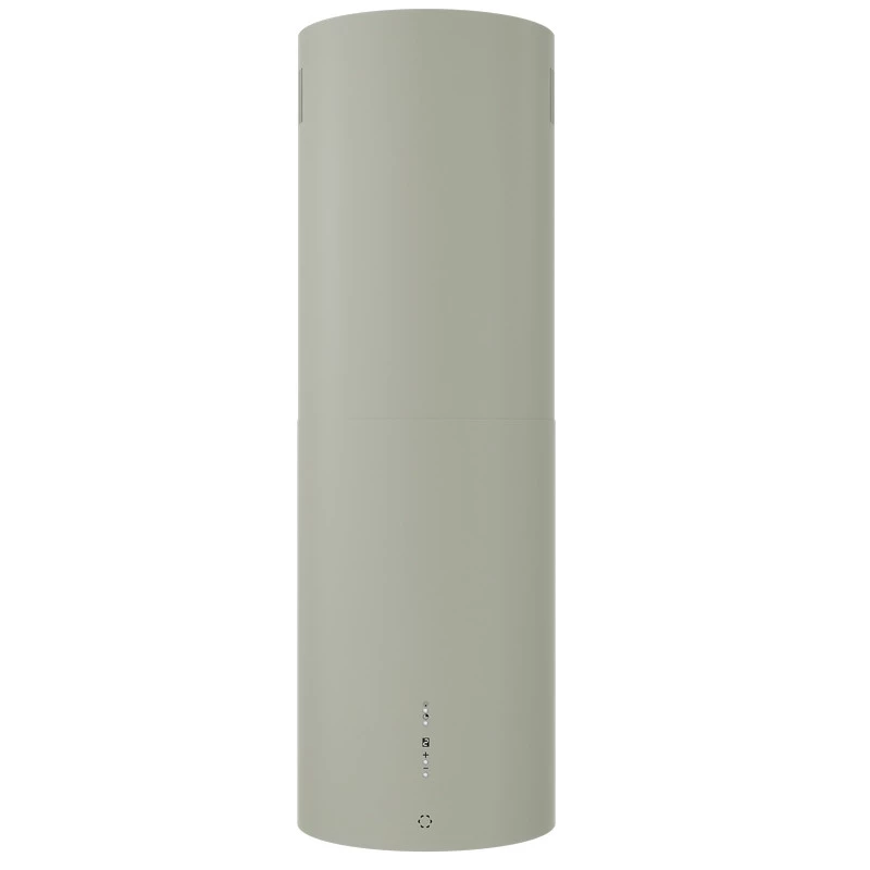 - Elegancki cylindryczny okap wyspowy w zielonym, szałwiowym odcieniu może działać zarówno jako wyciąg, jak i pochłaniacz. Jako wyciąg skutecznie usuwa opary na zewnątrz, a jako pochłaniacz – dzięki filtrowi węglowemu – oczyszcza powietrze w obiegu zamkniętym.