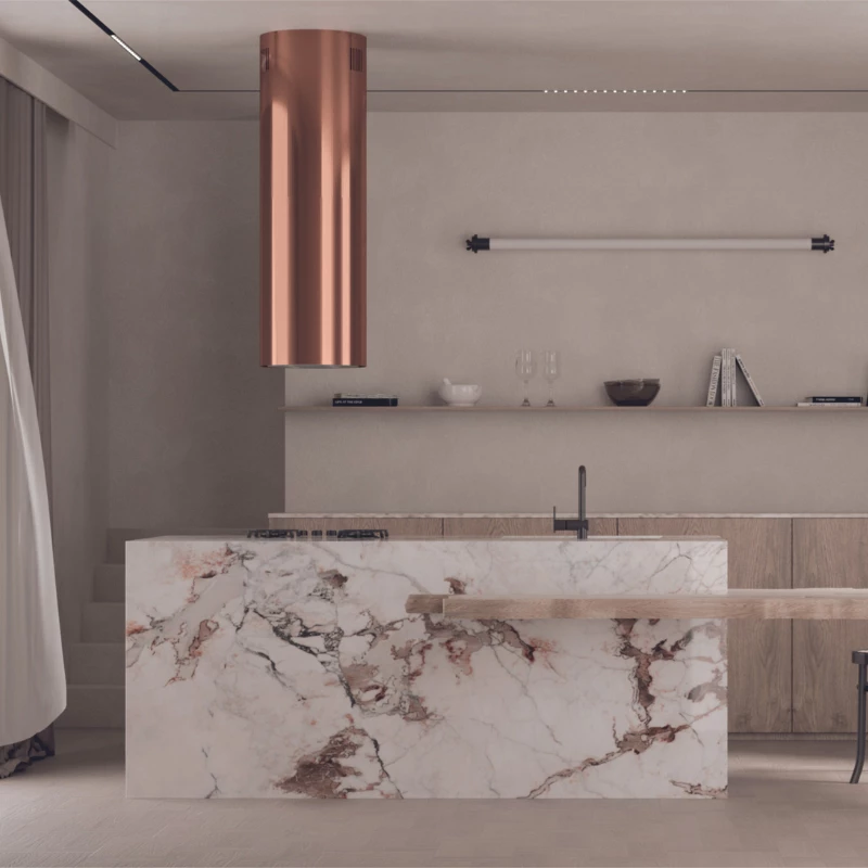 MateriałyDo produkcji okapu wyspowego Cylindro Isola 39.7 Miedziany zastosowano stal szlachetną (Inox), która została pomalowana na kolor miedzi.